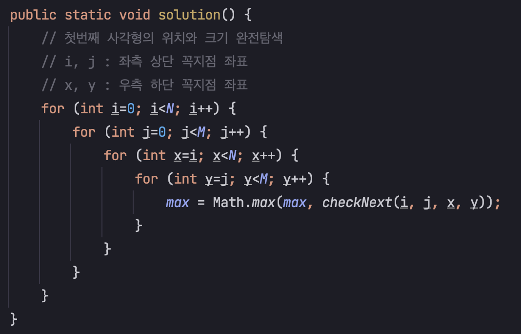 sumMax = Math.max(sumMax, sumOfFirstRect + getRectSum(i, j, x, y)); // 최댓값 갱신