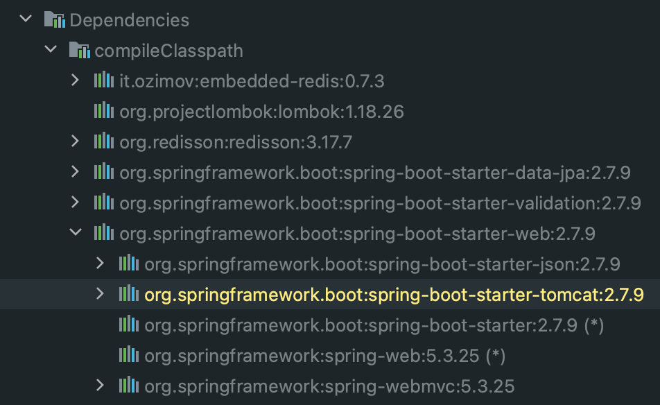 스프링 부트의 각 웹 애플리케이션에는 내장 WAS(Web Application Server)가 존재한다. 스프링 부트로 생성한 웹 애플리케이션 프로젝트에서 의존성을 확인해보면 위 사진과 같이 tomcat이 내장되어 있는 것을 확인할 수 있다. 따라서 특별한 설정 없이도 톰캣을 실행할 수 있다.