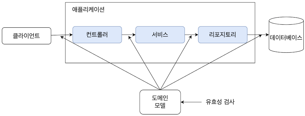 유효성 검사는 아래 이미지와 같이 각 계층으로 데이터가 넘어오는 시점에 해당 데이터에 대한 검사를 진행한다. 계층 간 데이터 전송에 대체로 DTO를 사용하고 있기 때문에 DTO를 대상으로 유효성 검사를 수행하는 것이 일반적이다.