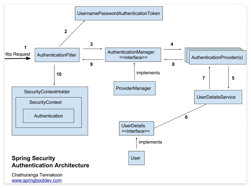 - 생성된 UserDetails 객체는 AuthenticationProvider로 전달되며, 해당 Provider에서 인증을 수행하고 성공하게 되면 ProviderManager로 권한을 담은 토큰을 전달한다.